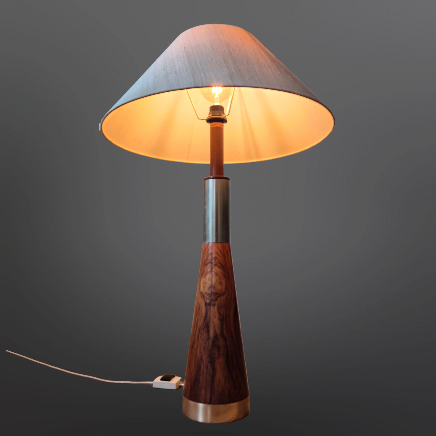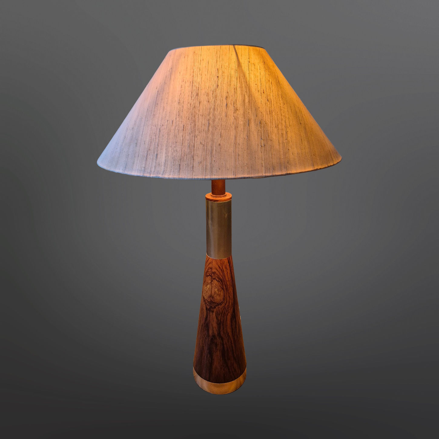 Mid century modern floor lamp. Made from wood, teak veneer and brass. The conical shaped base has an amazing woodgrain. Book-matched veneered teak on a turned wood base. The base itself measures 75cm in height and 16cm in diameter. The shade measures 59cm in diameter and 24cm in height.