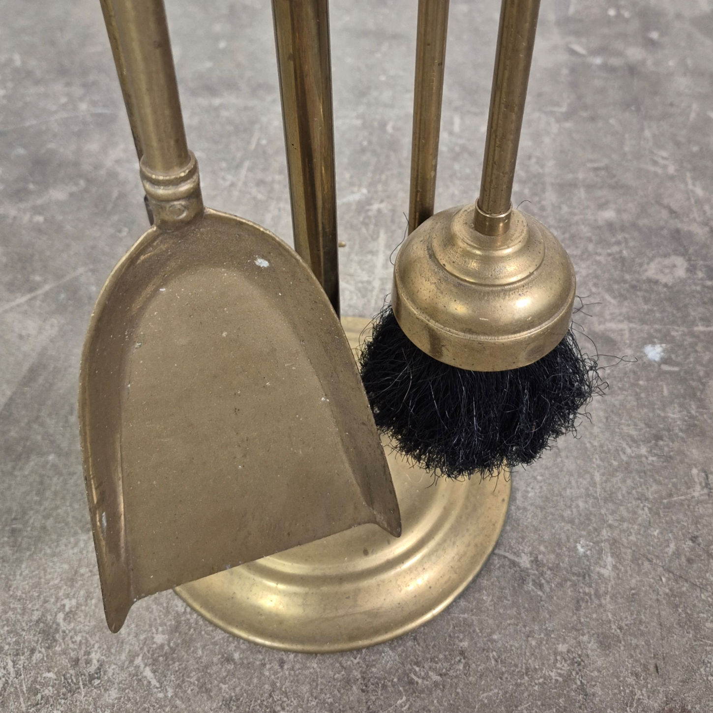 5 piece fireplace set with duck head decor. The set consists of 4 utensils and a central holder. Made from solid brass.