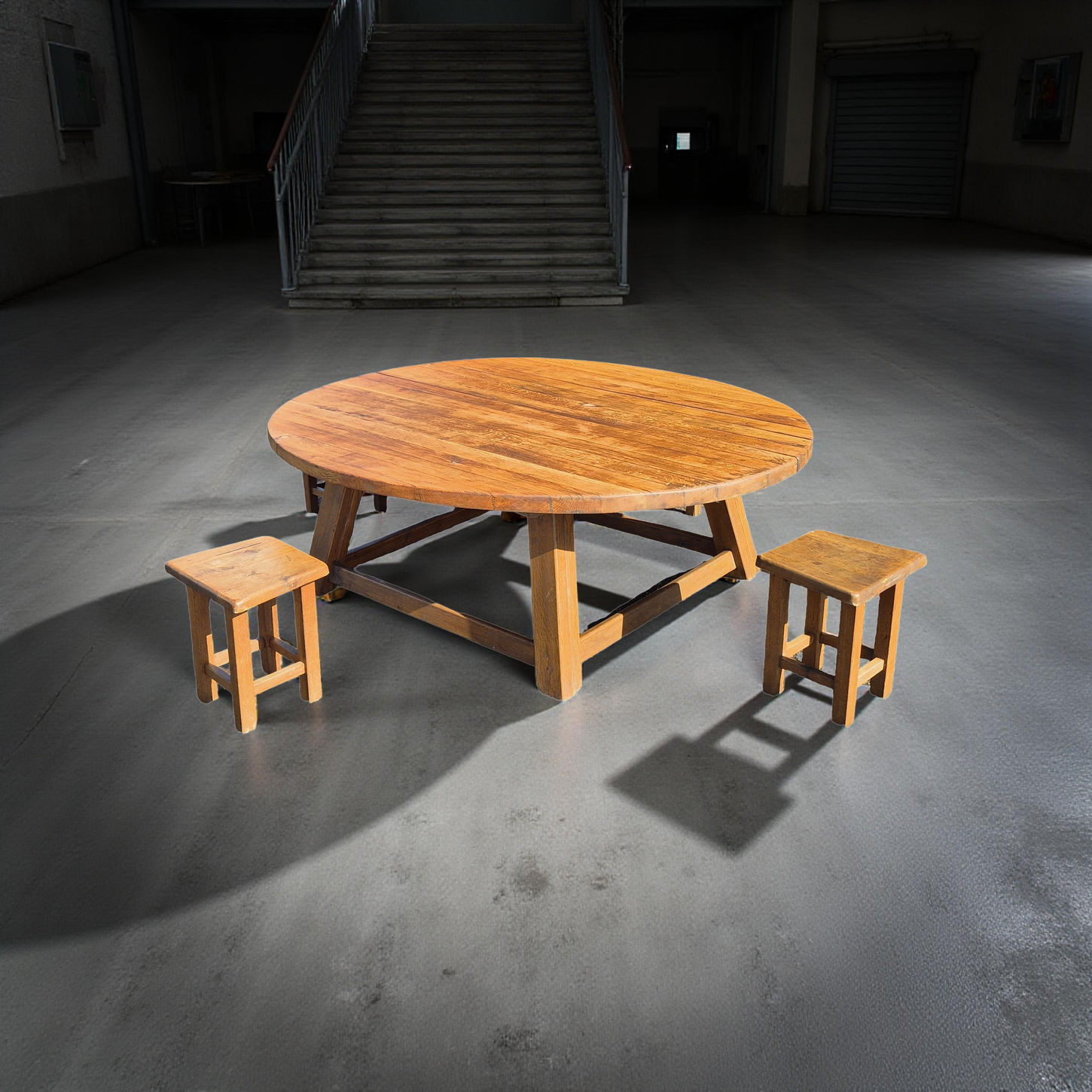Large brutalist oak dining table with stools, Netherlands 1960s