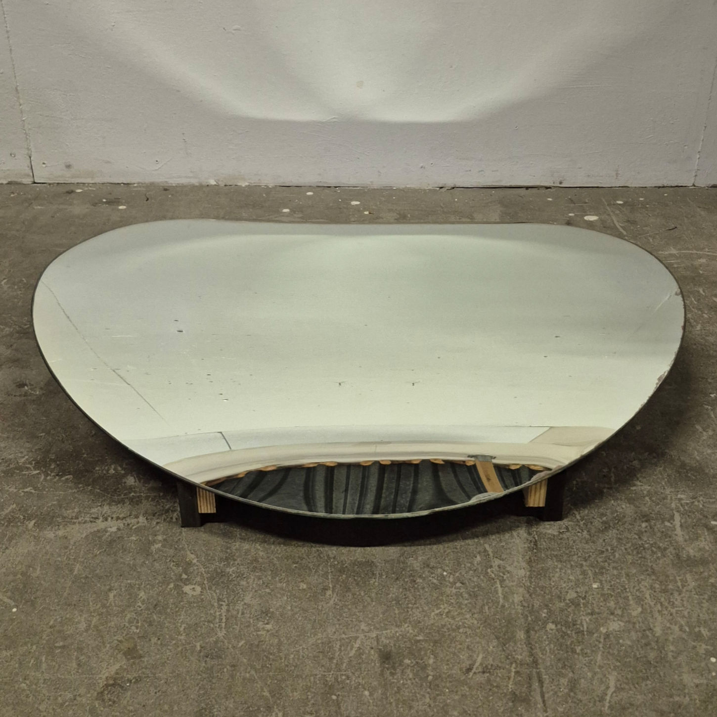 Amazing curved mirror. Made in the 1970s. The piece is crafted from real glass. The frame behind the mirror has been renewed with new plywood.