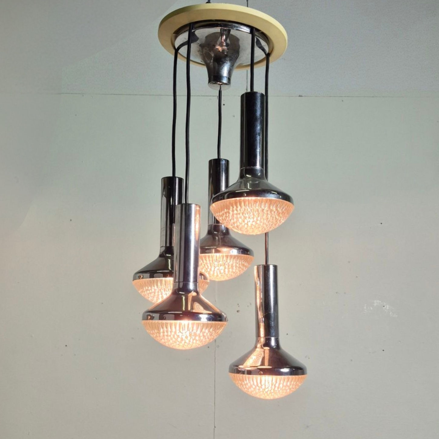 60s design pendant lamp with 5 lamps. The lamps are made of metal with a faceted glass diffuser.