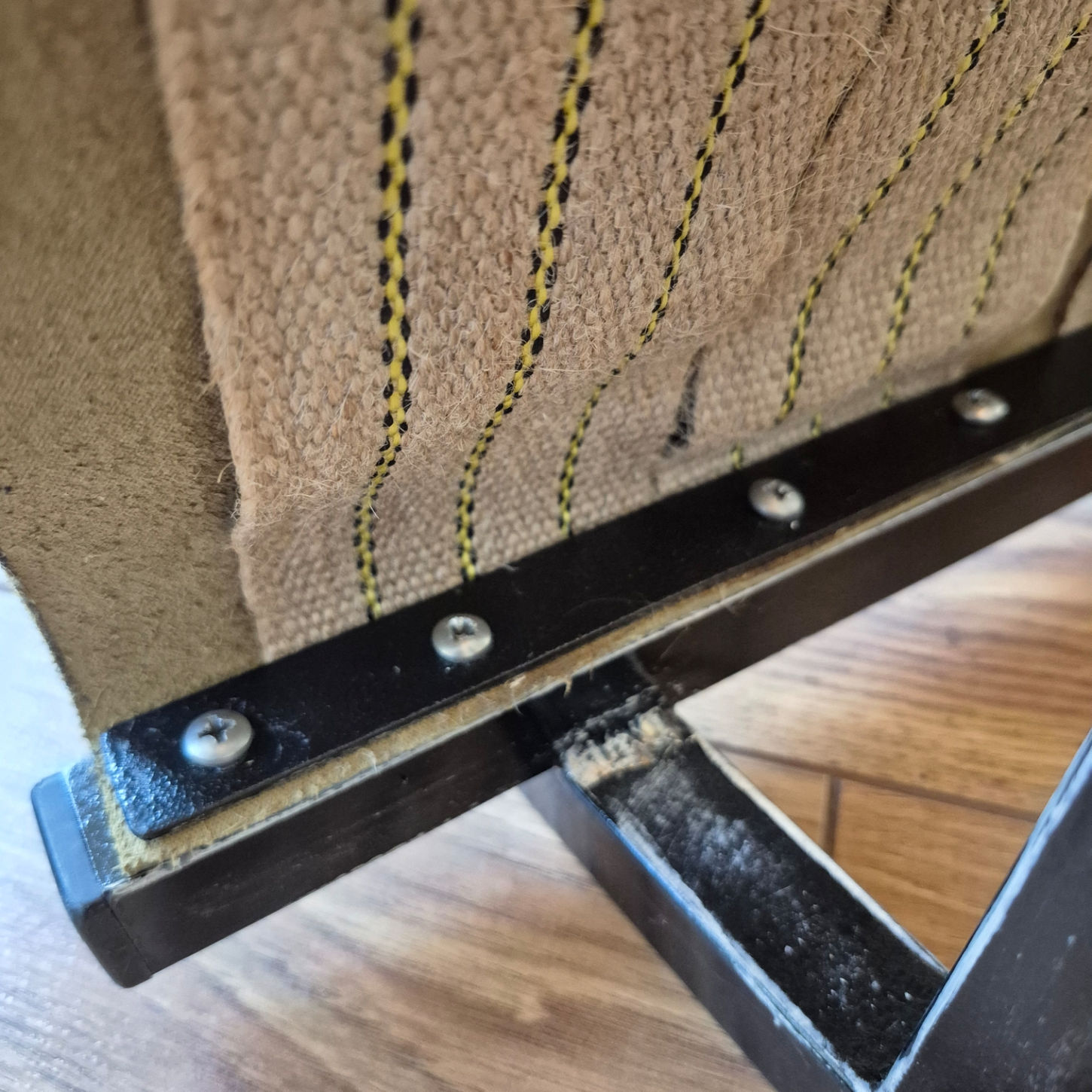 The frame is made from metal and it has the original paint. The loose, chipped paint has been removed revealing the bare metal and white base coat. Especially on the edges it gives it a worn, robust look.