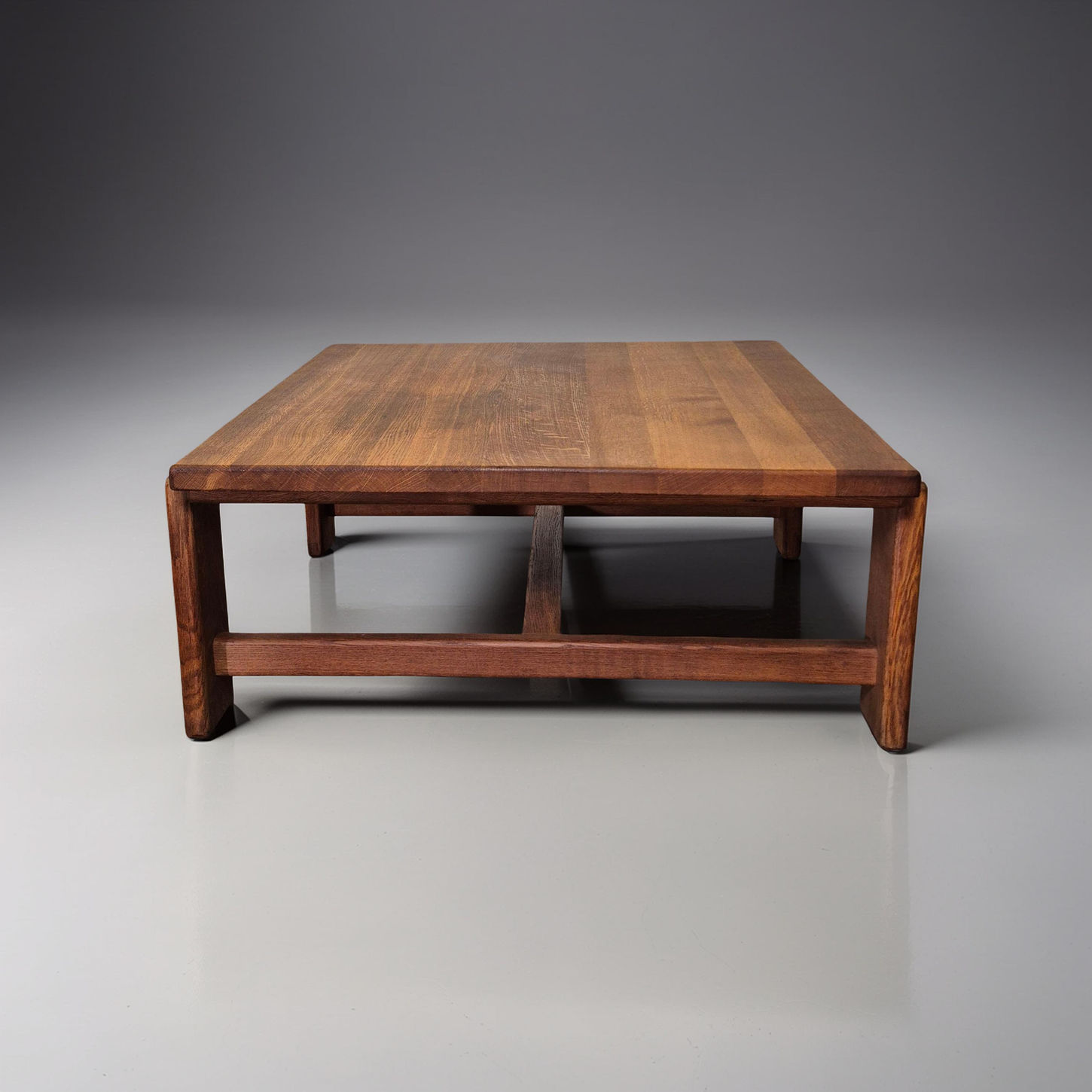 The wood has gained a patina throughout the years. The top shows signs of use like discoloration and staining contributing to the overall appearance of the table. It gives it a somewhat rustic and distressed look.