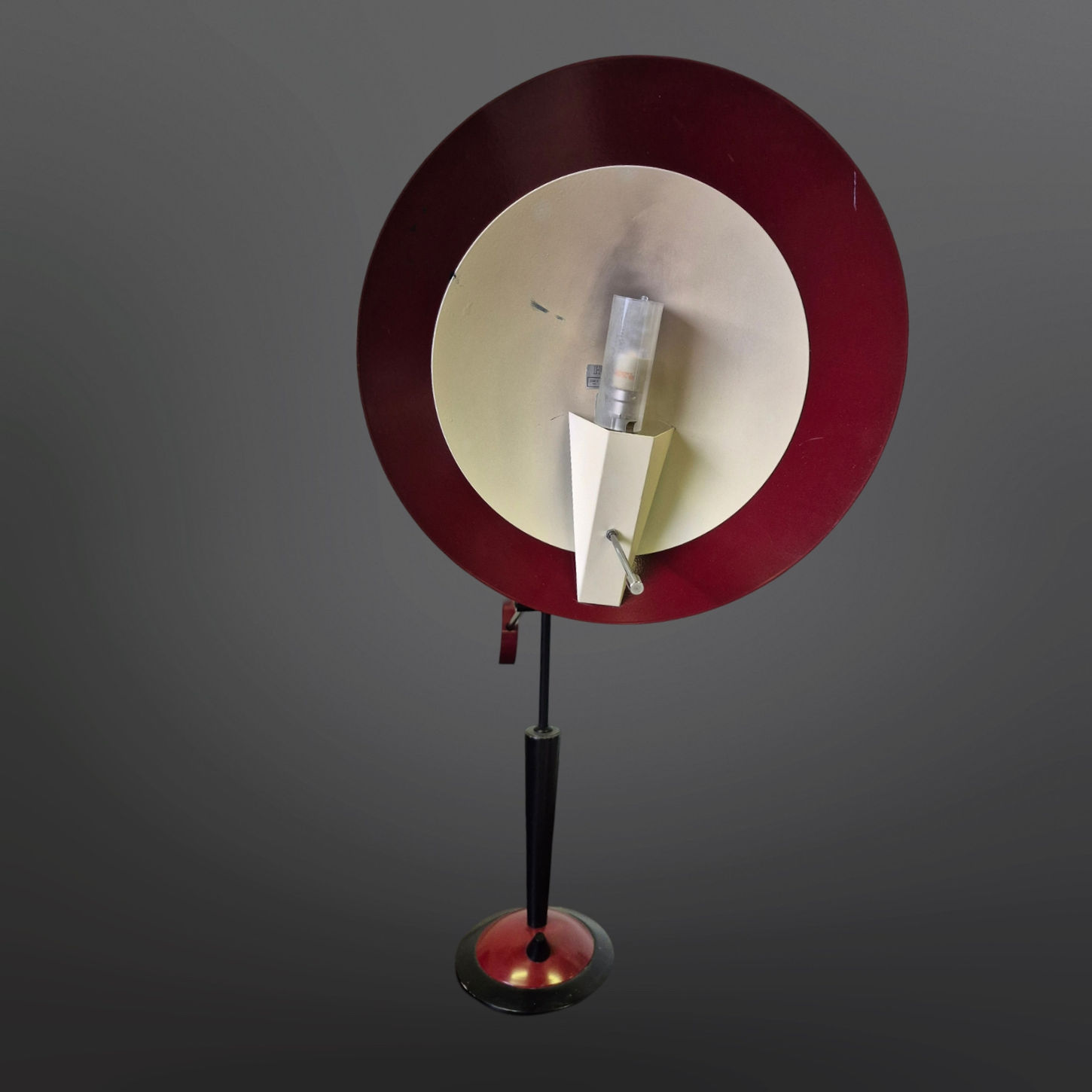 Large post modern design table or desk lamp. Made from wood and metal. It has a large disc shade with a metal counterweight. Adjustable in angle and rotatable.
