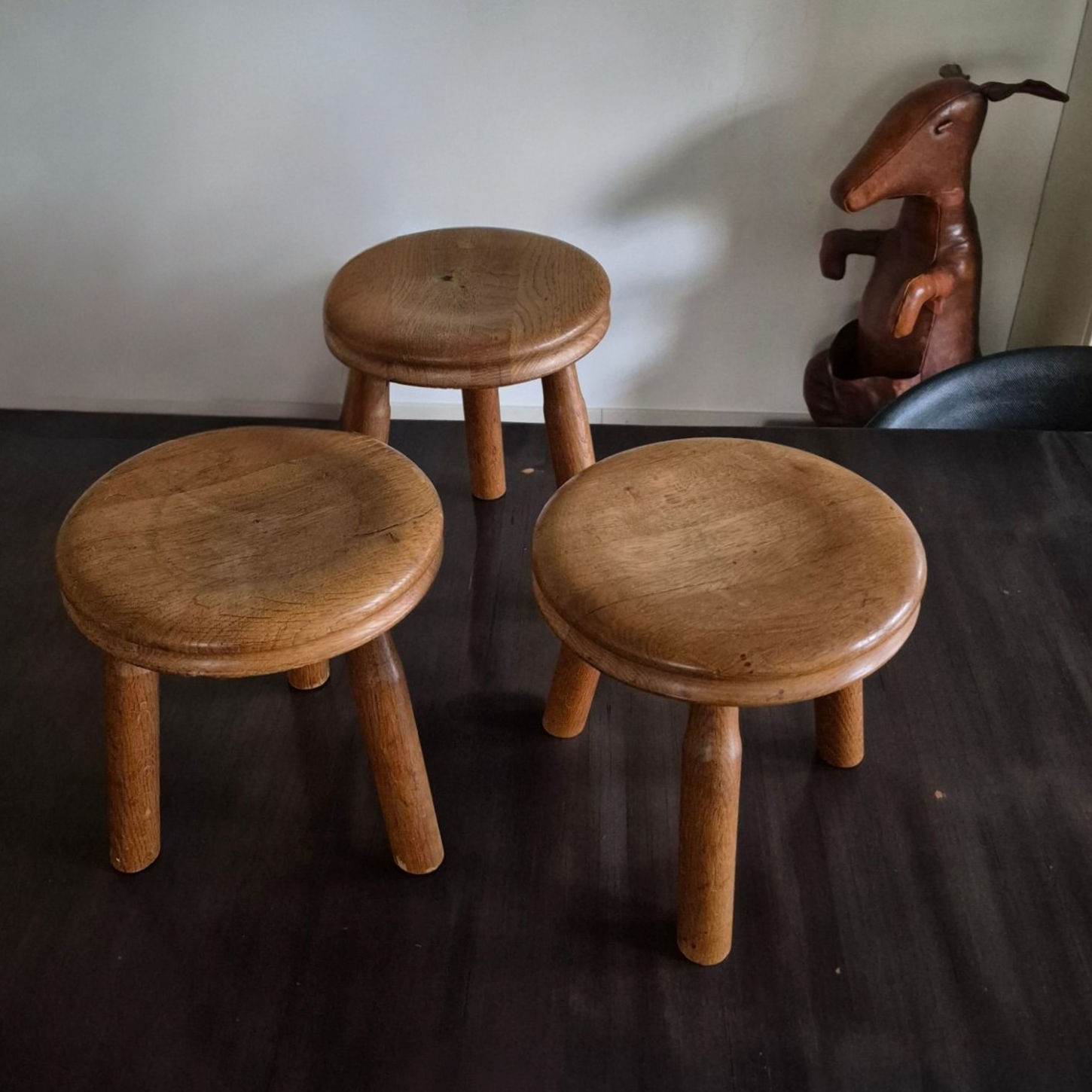 Set of 3 tripod stools. Original pieces in the manner of Charlotte Perriand and Pierre Chapo. They are made from solid oak. With the concave seats and the recessed line around the seat they stand out from most of the stools around.